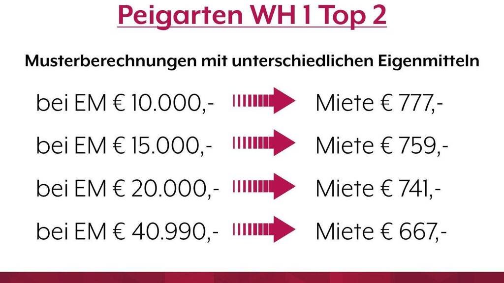 *Die regulären Eigenmittel für diese Wohneinheit betragen aktuell 40.990,-. Eine Reduktion auf mindestens 10.000,- ist auf Wunsch möglich. Natürlich sind auch höhere Beträge möglich. Bei höheren Eigenmitteln (als die Mindestbeträge) verringert sich die monatliche Miete. Beispiele dazu finden Sie am Foto: Musterberechnungen mit unterschiedlichen Eigenmitteln