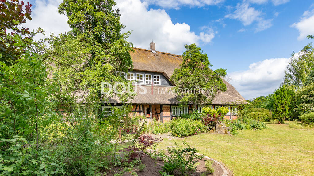 Die insgesamt 11 Zimmer des Hauses eröffnen kreative Freiräume für Wohnen, Arbeiten oder individuelle Projekte. Große Fensterfronten, sichtbare Holzbalken, Dielenböden und der charakteristische Reetdachstil schaffen eine besondere Wohnatmosphäre, die in dieser Form nur selten zu finden ist.
