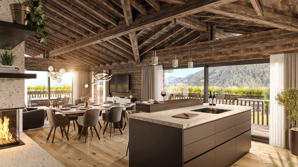 Diese exklusive Penthouse-Wohnung vereint luxuriöses Wohngefühl mit alpinem Charme auf höchstem Niveau. Auf rund 162 m² Wohnfläche erwartet Sie ein großzügig gestalteter Wohn- und Essbereich mit Kamin und beeindruckendem Sichtdachstuhl aus Altholz, der eine warme, einladende Atmosphäre schafft. Die raumhohen Fensterfronten öffnen den Blick auf die umlaufende Terrasse von ca. 100 m², die zu jeder Tageszeit Sonne und eine atemberaubende Aussicht bietet.