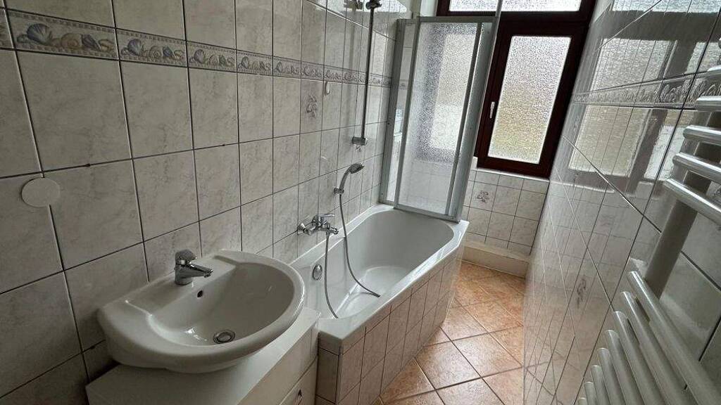 Wohnung 3 - EG: Flurbereich // Wohnzimmer // Schlafzimmer // Schlafzimmer // Bad mit Wanne, WC und Becken // Küche mit Ofenanschluss und Grundstückszugang // Bad mit WC und Dusche