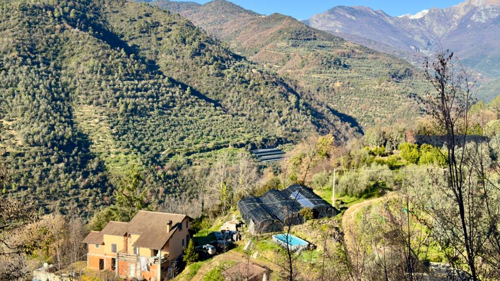 Das Anwesen liegt ruhig und umgeben von wunderbarer Natur an einem geschützten Süd-West-Hang zwischen Apricale und Isolabona. Von dieser einzigartigen Position genießt man einen traumhaft schönen Blick auf die umliegenden Hügel und den imposanten Monte Toraggio, der sich mit 1.971 m oberhalb des Val Nervia erhebt. Das ca. 2,8 ha große Grundstück ist ein Paradies für Naturliebhaber, es ist terrassiert und hat sehr viele eben Flächen, die als Olivenhain (ca. 85 Olivenbäume der Sorte Taggiasca), Obst- und Gemüsegarten sowie als Gärtnerei (u.a. mit Mimosen, Ruscus, Populus, etc.) bewirtschaftet werden. Das aufgestellte Schwimmbecken ist der ideale Platz für eine Erfrischung an heißen Sommertagen.