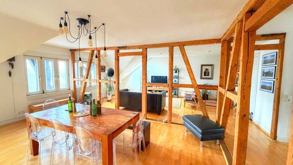 Die angebotene Eigentumswohnung befindet sich in zentraler Lage in Bad Homburg im 3. Obergeschoss eines denkmalgeschützten 4-Parteien-Hauses aus der Gründerzeit. Das Gebäude wird gut instand gehalten und überzeugt durch seine historische Bausubstanz sowie den gepflegten Gesamtzustand von Treppenhaus und Garten. Die Wohnung verfügt über ca. 128 m² Wohnfläche und beeindruckt besonders durch ein sehr großes Wohnzimmer mit freigelegtem Fachwerk, das der Einheit eine charakteristische und individuelle Atmosphäre verleiht. Neben dem Wohnzimmer stehen zwei Schlafzimmer, eine Küche sowie ein Tageslichtbad zur Verfügung. Ein besonderes Merkmal ist der interne Zugang zum Spitzboden, für den ein Sondernutzungsrecht besteht. Dieser Bereich bietet viel zusätzliche Nutzfläche und erweitert die Wohnmöglichkeiten des Objekts in funktionaler Weise. Die Bodenflächen sind überwiegend mit hochwertigem Ahornparkett ausgestattet. Zudem wurde die Heizung vor Kurzem erneuert. Die monatliche Hausgeldzahlung beträgt akutell inkl. Heizung 414,- Euro. Ein Kellerraum gehört ebenfalls zur Einheit.