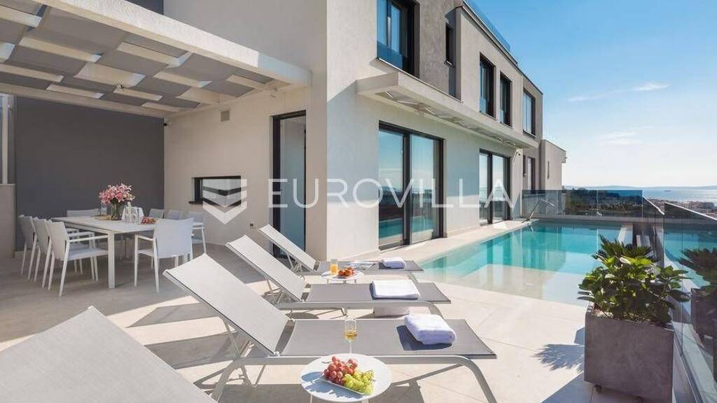 Split, Podstrana, luksuzna moderno opremljena vila s bazenom s cetiri spavace sobe, pet kupaonica, vanjskim bazenom i spa zonom dostupna je za dugorocan najam. Vila bruto povrsine 320 m2 sastoji se od tri etaze povezane liftom i unutarnjim stubistem. U podrumu je smjestena spa zona sa saunom i jacuzzijem te privatnom teretanom. U prizemlju je dnevni prostor s kuhinjom i blagovaonicom i dnevnim boravkom s izlazom u dvoriste s bazenom, suncalistem, ljetnom kuhinjom s kaminom i vanjskom blagovaonicom. Cetiri spavace sobe i pet kupaonica uz potpunu privatnost. Vili pripada jos zatvorena garaza za dva automobila s elektricnim punjacem te jedno vanjsko parkirno mjesto. Prekrasan panoramski pogled samo 15 minuta voznje od Splita i to u sklopu cuvanog i ogradenog naselja luksuznih vila. Vila je dostupna za najam do lipnja 2025. godine i uz mogucnost duljeg najma. Vise informacija na upit.... Vise na eurovilla.hr, ID: 571478