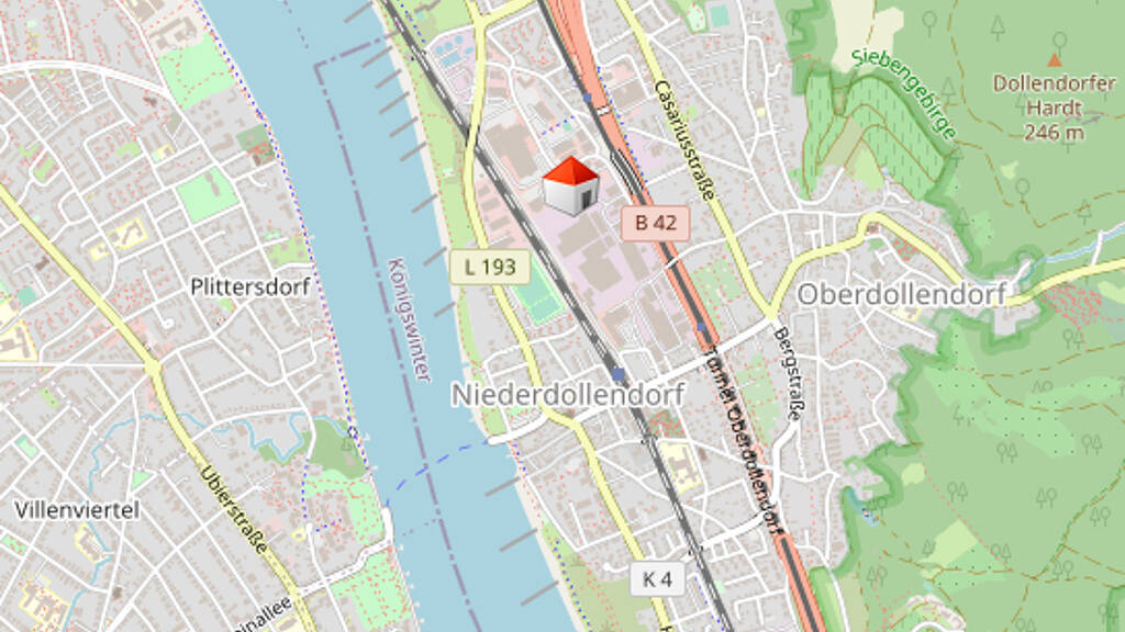 Gewerbegebiet Im Mühlenbruch in Königswinter - Oberdollendorf. Unmittelbar an der Ortsgrenze zu Bonn-Oberkassel, direkte Autobahnanbindung zur B42. Öffentliche Verkehrsmittel sind fußläufig erreichbar. Neben einer Tankstelle, einem Baumarkt und diverser Einzelhandelsflächen gibt es in diesem Gewerbegebiet moderne Büro- und Ärztehäuser.