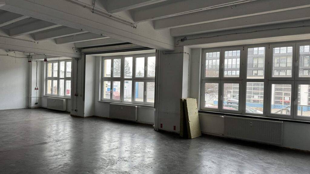 Die Gewerbeeinheit im vierten Obergeschoss des Haupthauses verfügt einen großen unterteilbaren Raum, vier bis 5 Büroräume und Toiletten. Sie eignet sich für stilles produzierendes Gewerbe, Werkstatt oder zur Büronutzung als auch als Lager. Der Zugang erfolgt über das rechte Treppenhaus. Im Rastermaß der Betonstützen ist der Einbau von Trennwänden möglich. Über die vorhandene Rampe und den Lastenaufzug ist eine LKW-Belieferung gegeben. Die Böden innerhalb der Einheit sind mit Linoleumelementen belegt.