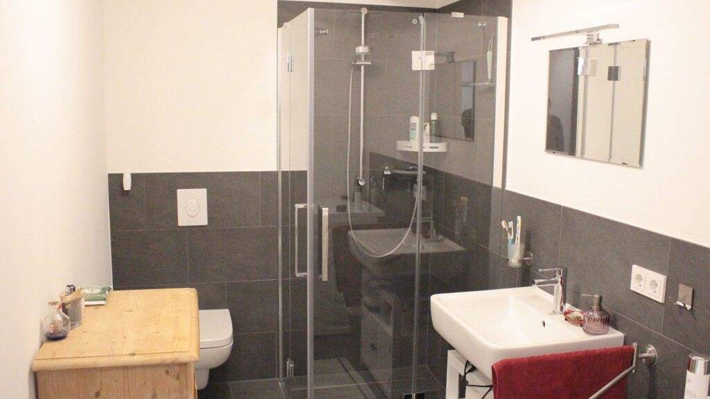 In den Wohn- und Schlafräumen ist pflegeleichter Vinylboden in Holzoptik verlegt. Die Fußbodenheizung sorgt für eine angenehme Temperierung. Für das Duschbad wurden anthrazitfarbene Fliesen ausgewählt.