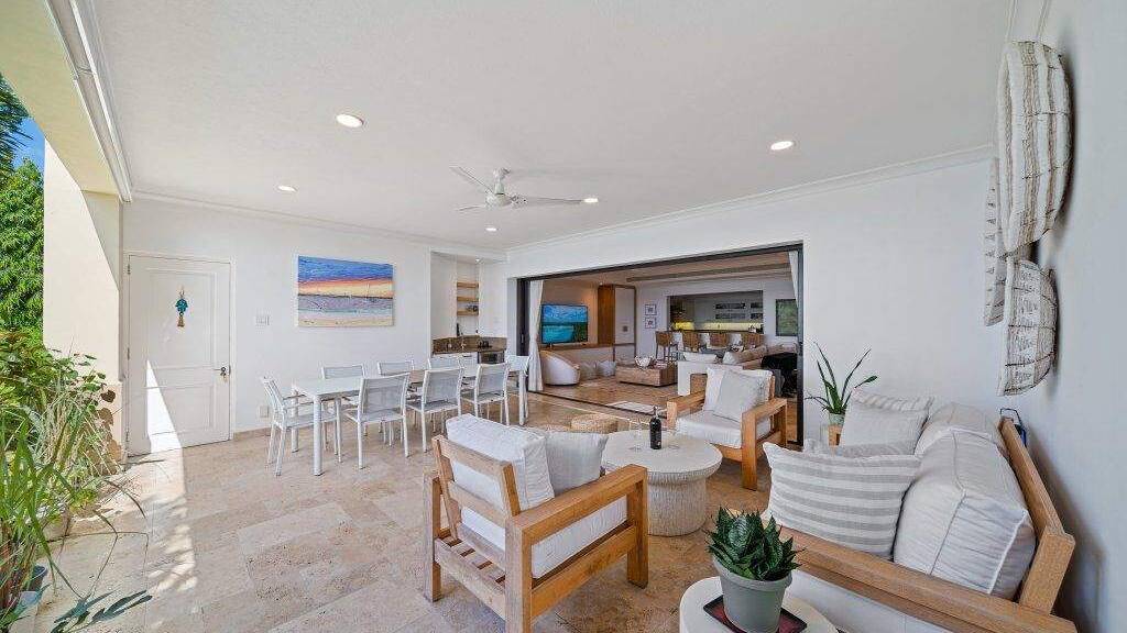 Entfliehen Sie zu raffiniertem Küstenluxus im Sandy Cove 101, einer eleganten 3.500 Quadratfuß großen Strandwohnung zum Verkauf in Derricks, St. James, Barbados. An der begehrten Platinum Coast der Insel gelegen, ist dieses geräumige Haus mit drei Schlafzimmern und 3,5 Bädern vollständig möbliert und schlüsselfertig und bietet müheloses Inselleben in einer der prestigeträchtigsten Strandgemeinden Barbados.
