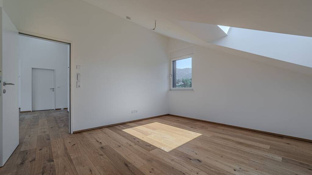Die Wohnung bietet eine reine Wohnfläche von 117 m², durchdacht aufgeteilt in einen Eingangs- und Garderobenbereich, einen offenen Wohn-, Küchen- und Essbereich mit Abstellraum sowie zwei gemütlichen Schlafzimmern und einem stilvollen Badezimmer mit Dusche und Wanne. Die Architektur setzt auf großflächige Fensterfronten und Dachflächenfenster, die nicht nur ein Maximum an Tageslicht bieten, sondern auch einen nahtlosen Übergang zwischen Innen- und Außenbereich schaffen, wodurch der Blick auf das majestätische Kaisergebirge zu einem ständigen Begleiter wird.