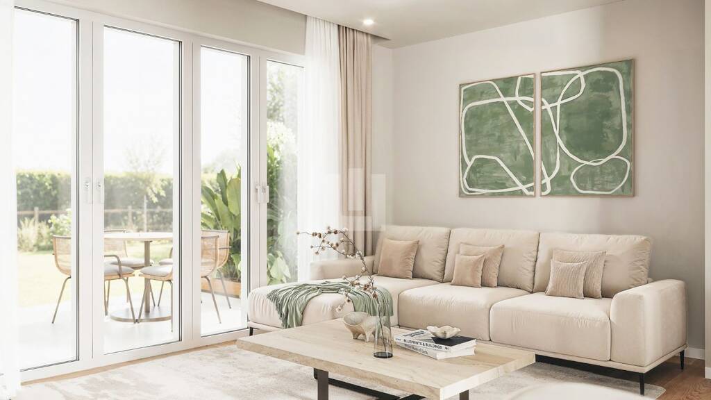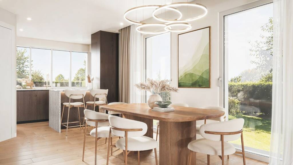Die Küche ist zum Wohnzimmer hin angeordnet und bietet genügend Raum für eine vollständige Einbauküche sowie einen Essbereich zwischen Küche und Wohnzimmer. Der großzügige Wohnbereich erstreckt sich zur Gartenseite hin und ist lichtdurchflutet, dank einer großen Fensterfront mit Zugang zur Terrasse und dem privaten Garten.