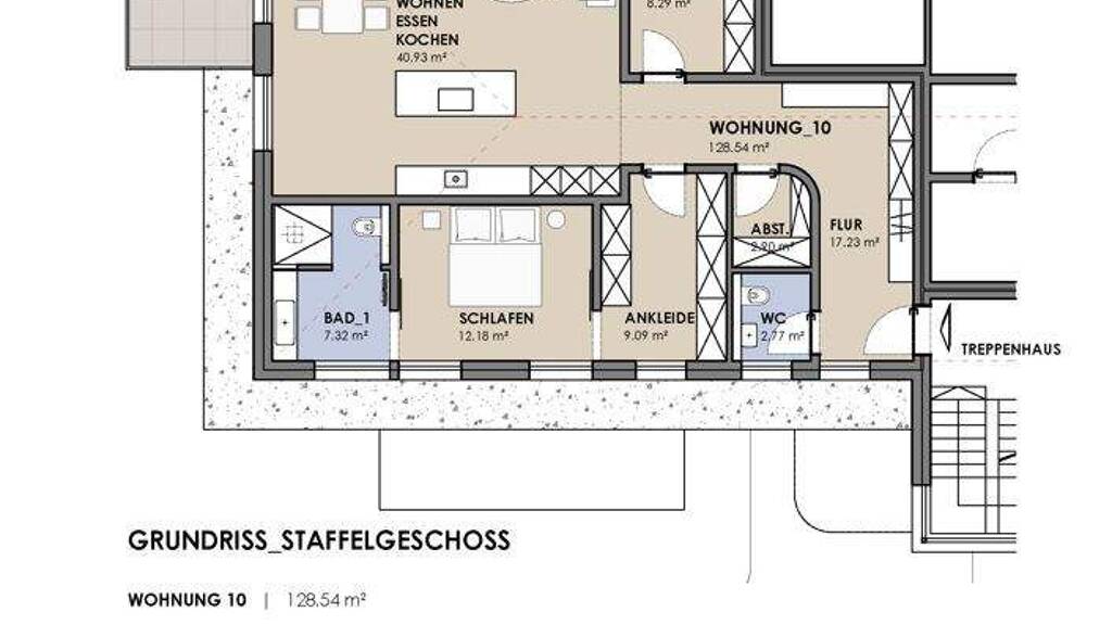 Herzstück der Wohnung ist der offen gestaltete Bereich Wohnen/Essen/Kochen mit ca. 40,93 m². Große Fensterflächen sorgen für eine helle Atmosphäre und schaffen einen fließenden Übergang nach draußen. Direkt angeschlossen liegt die Dachterrasse mit ca. 55,66 m², die den Wohnraum im Alltag spürbar erweitert und Platz für Essen, Lounge oder Begrünung bietet.