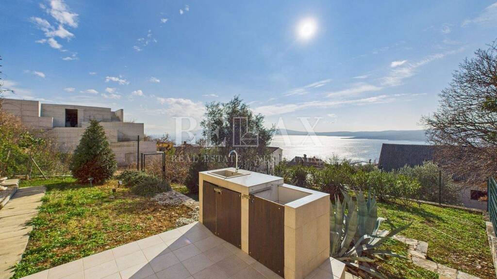 Das Erdgeschoss verfügt über eine funktionale Raumaufteilung mit zwei Schlafzimmern, einem Badezimmer, einem Wohnzimmer mit offener Küche und Essbereich, einem Flur, zusätzlichem WC, Heizraum und Waschküche sowie Zugang zur Terrasse mit beheiztem Pool. Neben dem Pool befindet sich ein gepflegter Garten mit einer kleinen Außenküche - ein perfekter Ort zum Entspannen und Zusammensein mit einem unvergesslichen Panoramablick auf das Meer.