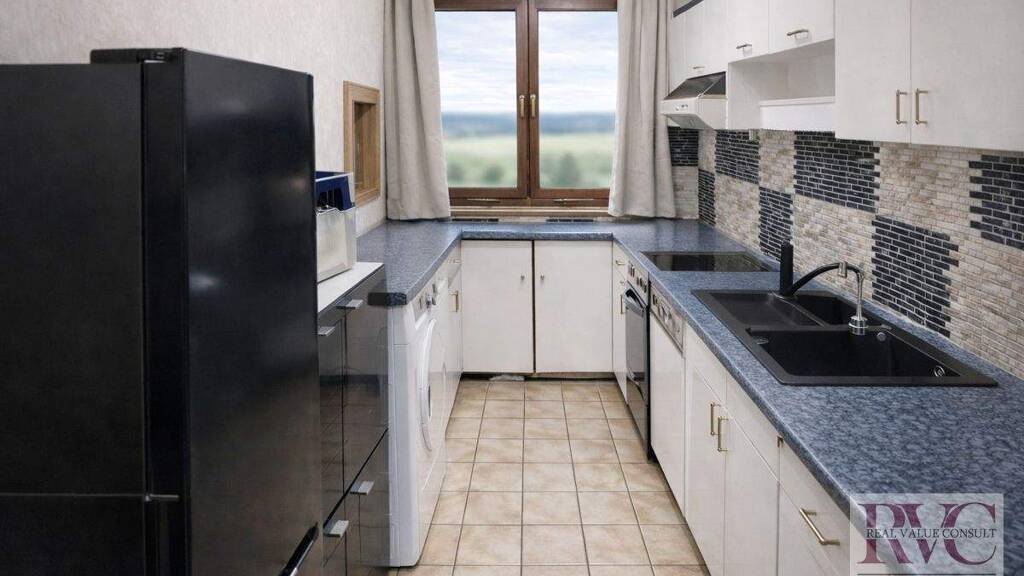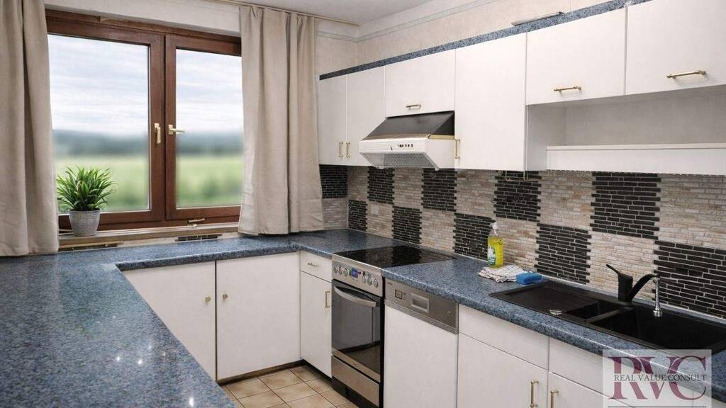 Die separat ausgeführte Küche ist eingerichtet und bietet eine solide Basis für eine spätere zeitgemäße Neugestaltung. Ein Waschmaschinenanschluss befindet sich ebenfalls in diesem Bereich.
