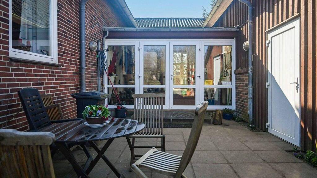 Die alte dänische Schule ist nun ein Ort der individuellen Entfaltung. Platz genug ist dafür auf jeden Fall. Eines der größten Highlights ist das riesige Grundstück: Neben dem großen Hofplatz direkt am Haus mit den zwei Wohneinheiten liegt direkt eine knapp einen Hektar große Fläche, auf der wunderbar Tiere laufen können. Ein Wasseranschluss befindet sich auf dem Areal an der Blockhütte, so dass auch eine Tränke installiert werden kann. Ein separat abgezäunter Bereich beherbergt einen Biotop. Natur pur! Der ursprüngliche Bau aus den 1960er Jahren wurde circa 1987 um einen Anbau erweitert. Das Dachgeschoss kann nun als Einliegerwohnung mit eigenem Eingang genutzt werden. Die seinerzeitige Nutzung ist noch gut zu erkennen und es sollten ein paar Modernisierungen erfolgen; somit gibt es daher einen guten Spielraum für eigene Ideen. Zwei der drei ehemaligen Klassenzimmer könnte man z. B. mittels Schiebetür auch zusammen nutzen - ob als Wohnraum, Kinderspielzimmer, Bibliothek, Kinosaal, Fitnessraum oder Billardzimmer, was auch immer Sie sich wünschen! Für den Komfort gibt es einen Kaminofen- und einen Glasfaseranschluss. Die Bäder und auch die Küche sind momentan eher spartanisch eingerichtet, so dass es sich lohnt, die Ausstattung nach Ihren Wünschen zu ändern. Auf dem "Schulhof" kann man jede Menge Fahrzeuge platzieren, somit haben Sie auch für Ihre Gäste genügend Möglichkeiten. Hier steht auch ein praktischer Schuppen für die Unterbringung von Fahrrädern und allerlei Gerät. Die geschützte Terrasse vor dem Eingang bietet sich für gemütliche Kaffeerunden an. Die Umgebung ist so vielfältig, dass man kaum alles hier erwähnen kann. Sei es die Nähe zu Dänemark, die Weite in den Kögen, die zahlreichen kulturellen und gastronomischen Angebote oder das Meer und die Inseln in wenigen Kilometern Entfernung. Dies ist ein Platz zum Ankommen!