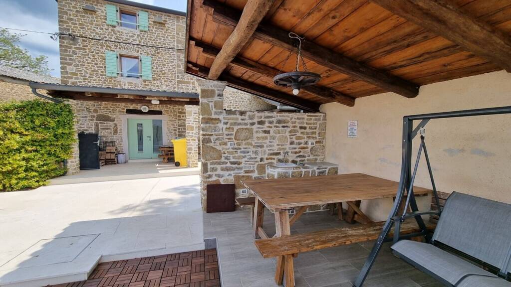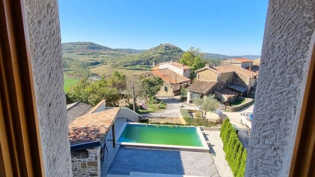 Dieses typisch istrische, im Jahr 2018 komplett revitalisierte Steinhaus ist das letzte Haus von mehreren, aneinandergebauten Häusern. Es befindet sich auf einem Hügel in einem kleinen istrischen Dorf gegenüber von Motovun in absoluter Ruhelage.