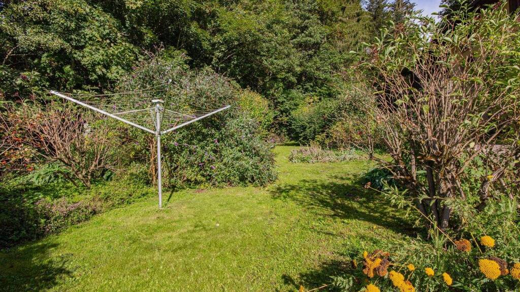 Dort gedeihen eine historische Duftrose und eine bunte Blumenwiese - ein Paradies für Bienen und Naturliebhaber. Ein kleiner Bach, der am Grundstück entlangfließt, verstärkt den idyllischen Charakter.