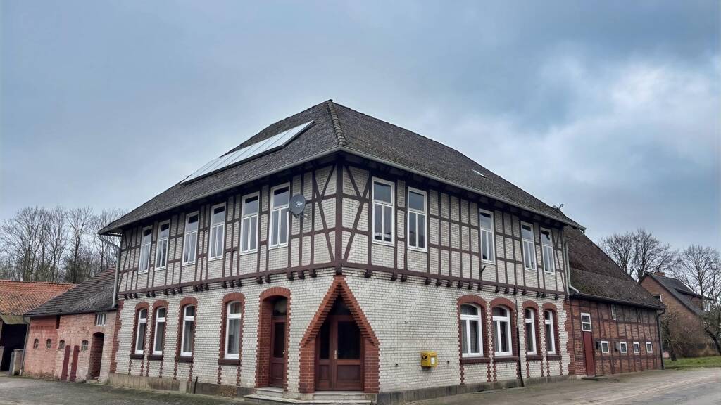 Massives, optisch ansprechendes Gebäude (ehemalige Gaststätte) mit Scheunendiele und mehreren Stallgebäuden. Das Haupthaus teilt sich auf in den Eingangsbereich mit Terrazzoboden und offener Treppe in das Obergeschoss zum ehemaligen Saal. Weiterhin vier Räume (inkl. ehemaligen Gastraum), große Küche mit Küchenhexe und Ausgang in den Innenhof, Bad mit Wanne und Dusche, Speisekammer, Zugang zur Diele von der Küche, Teilkeller (zwei Räume). Im Oberschoss befinden sich der ca. 250 m² große Saal mit kleiner Bühne, ein einfaches Zimmer und zwei weitere Abstellräume. Der über dem Saal vorhandene Dachboden ist weiter ausbaufähig. Die Fenster sind im Erdgeschosse aus Holz und isolierverglast. Die Fenster im Obergeschoss sind einfach verglast. Geheizt wird mit einem Biomassekessel als Hybrid mit einem Heizölkessel, die auch das warme Wasser bereitet. Unterstützt wird die Heizanlage mit sechs Felder Solarthermie. Die Dächer sind mit Faserzementplatten eingedeckt. In die Außenwände und Decke wurde Thermofloc eingeblasen. Die Nebengebäude haben eine Grundfläche von ca. 300 m², das angrenzende Grundstück mit einem aufstehenden Nebengebäude (Garage, Stallungen, vermietet) wird mit erworben, kein Denkmalschutz.