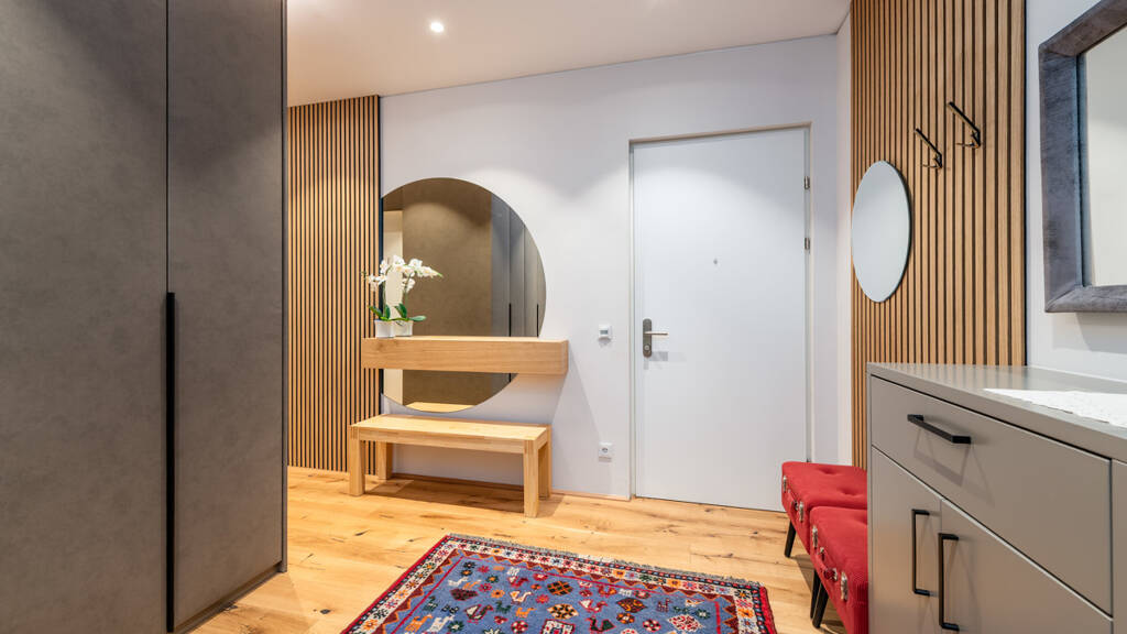 Innen empfängt die Wohnung mit warmen Holzböden, großzügigem Schnitt und viel Raum zum Leben. Die offene, moderne Küche lädt zum geselligen Beisammensein ein, geschmackvolle Fliesen in den Nassräumen verbinden Eleganz mit Funktionalität. Ein separates Gästezimmer mit eigenem Bad schafft Privatsphäre für Besucher.