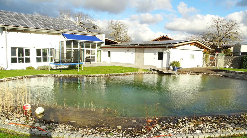 Auf dem großzügigen, von außen nicht einsehbarem Grundstück befinden sich ein Naturbadesee mit Regenerationsteich (das Wasser hat nahezu Trinkwasserqualität), Pavillon und großer Garten.