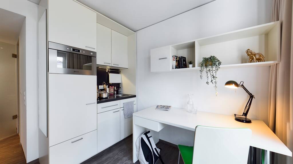 - Komplett möbliert (Bett, Schrank, Schreibtisch mit Stuhl) - Einbauküche - Bad mit Dusche - Highspeed WLAN - Fahrradstellplätze - Waschräume - Gemeinschaftsflächen - Mietbare Pkw-Stellplätze - Mietbare Kellerräume - Digitale Dokumente - Mieter:innen-Service per App