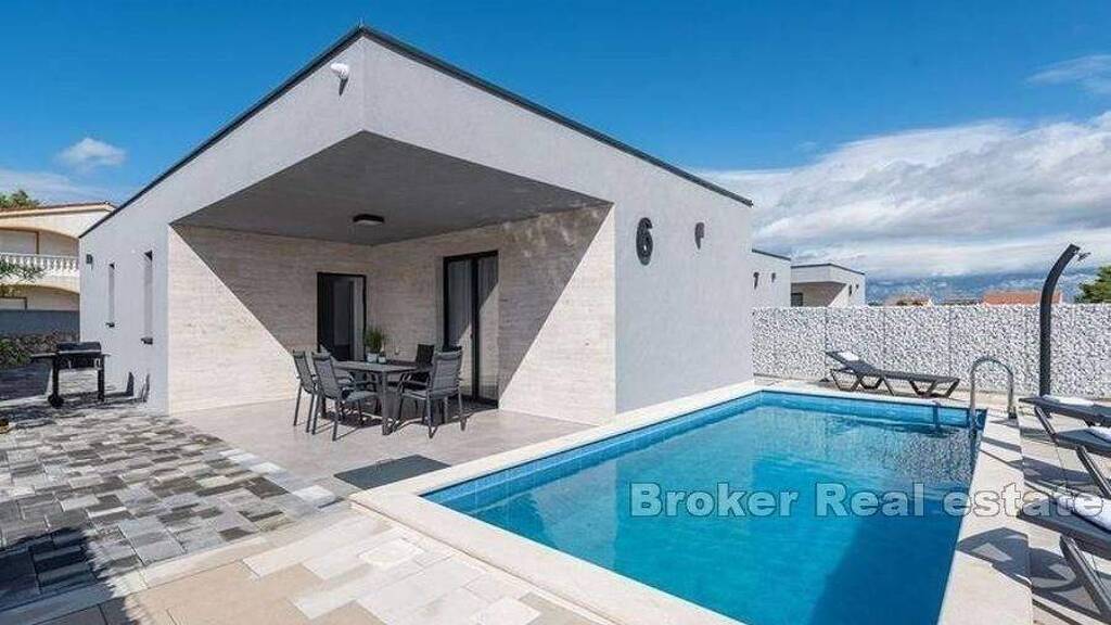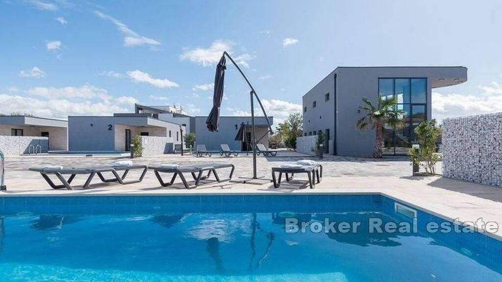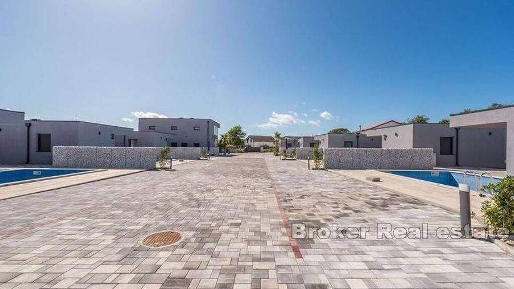 Zu jedem der Häuser gehören durchschnittlich 350 m2, davor befinden sich ein Swimmingpool, Parkplätze und ein angelegter Garten mit Gartenmöbeln.