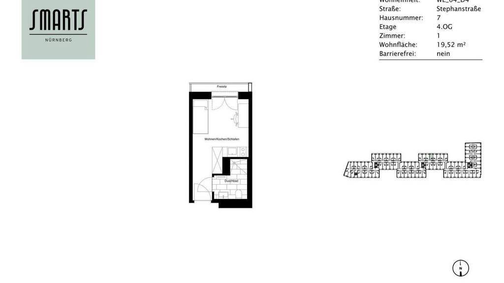 Das moderne Mikroapartment ist Teil der Apartmentanlage "SMARTS Nürnberg". Über 7 Stockwerke verteilt befinden sich 459 möblierte Apartments. Aufgrund der modernen Ausstattung und Möblierung können die neuen Bewohner des SMARTS Nürnberg unkompliziert mit dem Koffer einziehen. Wer Lust hat gleichgesinnte Mitbewohner zu treffen kann hierfür die Gemeinschaftslounge mit Zugang zur Dachterrasse nutzen. Zudem steht den Bewohnern ein Waschraum mit Waschmaschinen und Trocknern (kostenpflichtig) zur Verfügung.