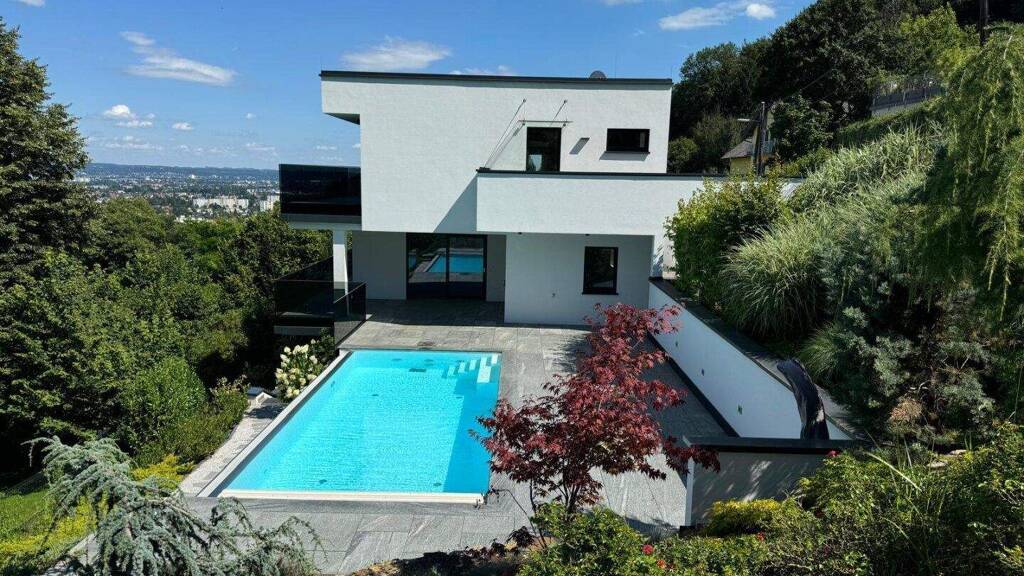 Die extravagante Villa 373 m² große Neubau-Villa befindet sich in sonniger Hanglage und bietet einen wunderbaren Ausblick über die Dächer der Stadt Graz. Inmitten der herausragenden Architektur am Ölberg residieren Sie hier zwischen luxuriösen Villen in bester Nachbarschaft. Durch den praktischen Personenlift sind alle drei Ebenen bequem erreichbar. Einen weiteren Pluspunkt stellt die separat zugängliche Einliegerwohnung/Büro dar, welche durch eine großzügige Außentreppe erschlossen ist und durch den überdachten Terrassenbereich aufgewertet wird. Das rund 92 m² große Wohnzimmer bildet das Herzstück der Villa und wird durch den direkten Zugang zum Infinitypool veredelt. Hier schwimmen Sie über den Dächern der Stadt in einzigartiger Privatsphäre. Im erstklassig aufbereiteten Garten erfahren Sie eine Symbiose aus grüner Idylle und moderner Architektur. Das weiße Marmor-Stiegenhaus mit geschwungenem Handlauf, der hochwertige Eichen-Fischgrätboden und die weitläufige Dachterrasse samt Dachgarten machen dieses Angebot so einzigartig. Bei Bedarf besteht außerdem noch die Möglichkeit, 450 m² Bauland vom Nebengrundstück zuzukaufen.