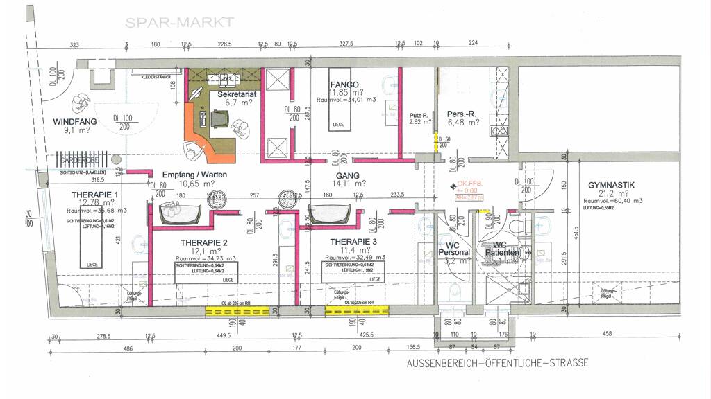 Klassisches Entré mit Windfang in Glas ca. 9,1 qm Empfang mit Reception - Wartezone & Sekretariat ca. 19,1 qm 3 gepflegte Therapieräume (auch als Büros nutzbar) mit je ca. 11,7/12,1/11,4 qm 1 großzügiger Gymnastik - oder Therapieraum (auch als Büroraum nutzbar) mit ca. 21,2 qm 1 Personal- Aufenthaltsraum mit gemütlicher Küchenzone und Abstellraum/Lager ca. 8,6 m2 1 Fangoraum mit Dusche ca. 11,6 qm 2 Bäder mit je ca. 3,2 / 3,7 qm 1 Waschmaschinenanschluß Jeder Therapieraum / Büroraum enthält ein Waschbecken sowie eine stilvolle Beleuchtung.