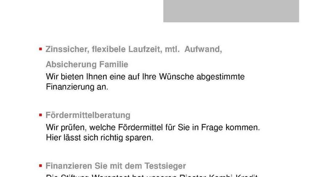 Gerne erstellen wir Ihnen ein Finanzierungsangebot unter Einbindung aller staatlichen Förderungen des Landes und Bundes (KfW-Darlehen, Riesterförderung, öffentliche Mittel).