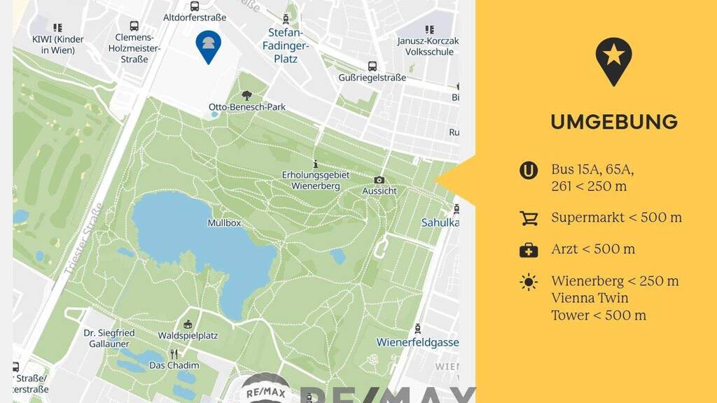 Das gegenständliche Objekt liegt in der nachhaltigen Biotope-City am Wienerberg, die sich als Gartenstadt des 21. Jahrhunderts versteht, unmittelbar neben dem Otto-Benesch-Park und am Rande des weitläufigen Erholungsgebiets Wienerberg. Eine hohe Lebensqualität direkt vor der Haustüre ist somit gesichert. Ein gut ausgebautes, 14 km langes Wegnetz, der wunderschöne Wienerbergteich, idyllische Liegewiesen, zahlreiche Sport- und Spielplätze etc. bilden ein einzigartiges grünes Naturjuwel mitten in der Stadt. Der Vienna Twin Tower-Gebäudekomplex (der unter anderem das Cineplexx Wienerberg beherbergt) sowie zahlreiche Einkaufsmöglichkeiten des täglichen Bedarfs (BILLA PLUS, BILLA, HOFER, BIPA etc.) sind fußläufig in Kürze erreichbar
