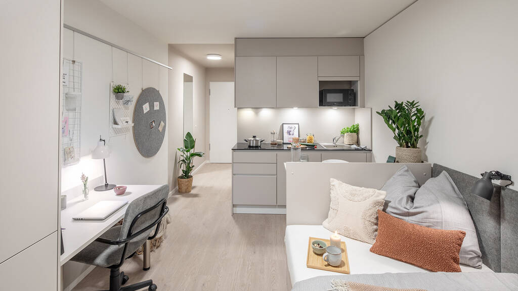 •Living and working area: bed incl. mattress, desk with chair and lamp, wardrobe with mirror, lightproof curtains, intercom and generally extra storage space