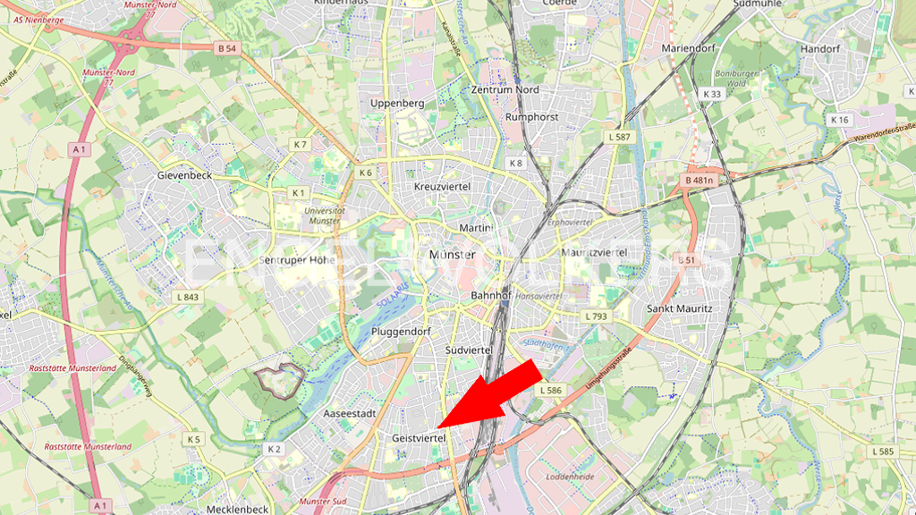 Die Stadt Münster ist ein traditioneller Universitätsstandort und gilt als kulturelles und wirtschaftliches Zentrum des Münsterlandes. Mit der A1 und der A43 sind direkte und schnelle Anbindungen an das Ruhrgebiet gegeben. Münster ist außerdem ICE?Haltepunkt und ein wichtiger IC/EC?Knotenpunkt zwischen Hamburg, Frankfurt und Berlin. Zudem verfügt die Stadt mit dem nur ca. 30 km entfernt gelegenen International Airport Münster/Osnabrück über eine Anbindung an den nationalen und internationalen Luftverkehr. Das Projekt befindet sich in zentraler Lage des beliebten Geistviertels. Die Nachbarschaft ist geprägt durch eine gewachsene Wohnbebauung. Die Entfernung zum Prinzipalmarkt mit seinen vielfältigen Einkaufs- und Flaniermöglichkeiten sowie zum beliebten Aasee und der Promenade beträgt lediglich ca. 5-10 Minuten. Im direkten Umfeld befinden sich diverse Freizeitmöglichkeiten sowie sämtliche Infrastruktureinrichtungen des täglichen Bedarfs.