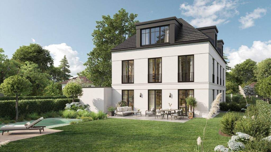Die Fassade mit feiner Bossierung und das langlebige Aluminiumdach unterstreichen den hohen Anspruch an Qualität und Gestaltung. Geplant sind zudem großzügig angelegte Terrassen und Zuwegungen, die den privaten Außenbereich zu einer echten Wohlfühloase machen.
