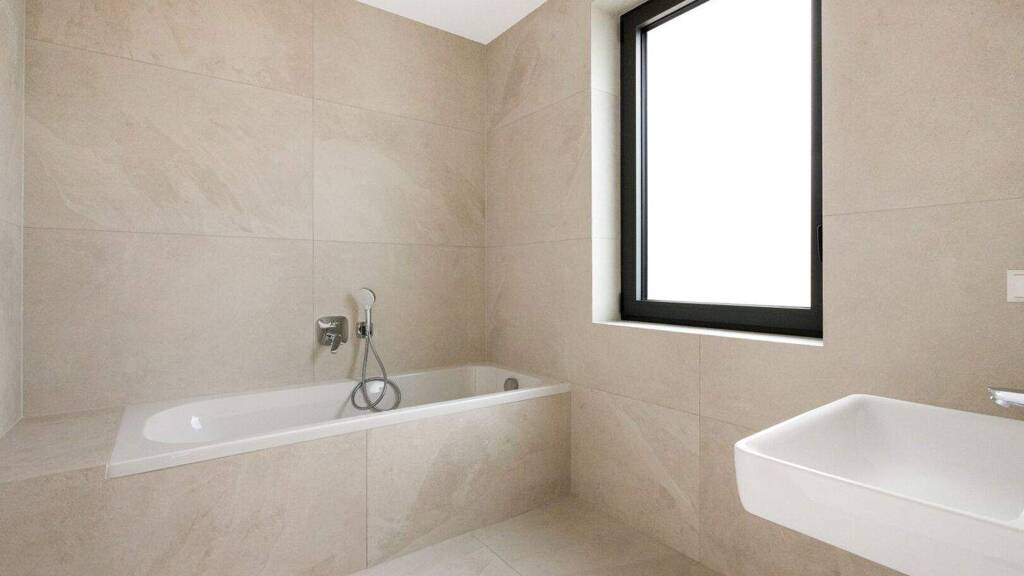 * Geschmackvolle großformatige (75x150 cm) Feinsteinzeugfliesen in den Nassräumen, im Vorraum und im Wirtschaftsraum