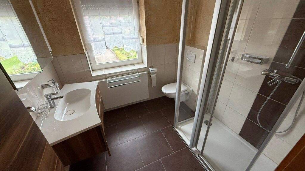 Im Erdgeschoss erwartet Sie ein offener Wohn- und Küchenbereich mit einer gepflegten Einbauküche, ausgestattet mit Markengeräten. Der Wohnbereich verfügt über eine Luft-Luft-Wärmepumpe mit Smart-Steuerung, die sowohl zum Heizen als auch zum Kühlen genutzt werden kann. Von hier aus gelangen Sie direkt in den Wintergarten, der mit drei Glasschiebeelementen und Markisen ausgestattet ist und einen geschützten Blick in den Garten bietet. Ergänzt wird das Erdgeschoss durch ein Gäste-WC im Eingangsbereich.