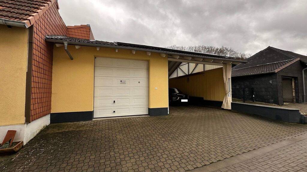 Eine große Werkstatt mit Werkbank, Regalen und Hochschränken bietet Platz für handwerkliche Tätigkeiten und ist auch für das Abstellen oder Reparieren von PKWs und Transportern geeignet. Angrenzend befindet sich ein Carport mit zwei Stellplätzen, Wallbox und Aufzug. Durch bewegliche Wände kann der Carport zu einem geschlossenen Raum umfunktioniert werden. Zusätzlich steht ein weiterer Stellplatz direkt am Haus zur Verfügung.