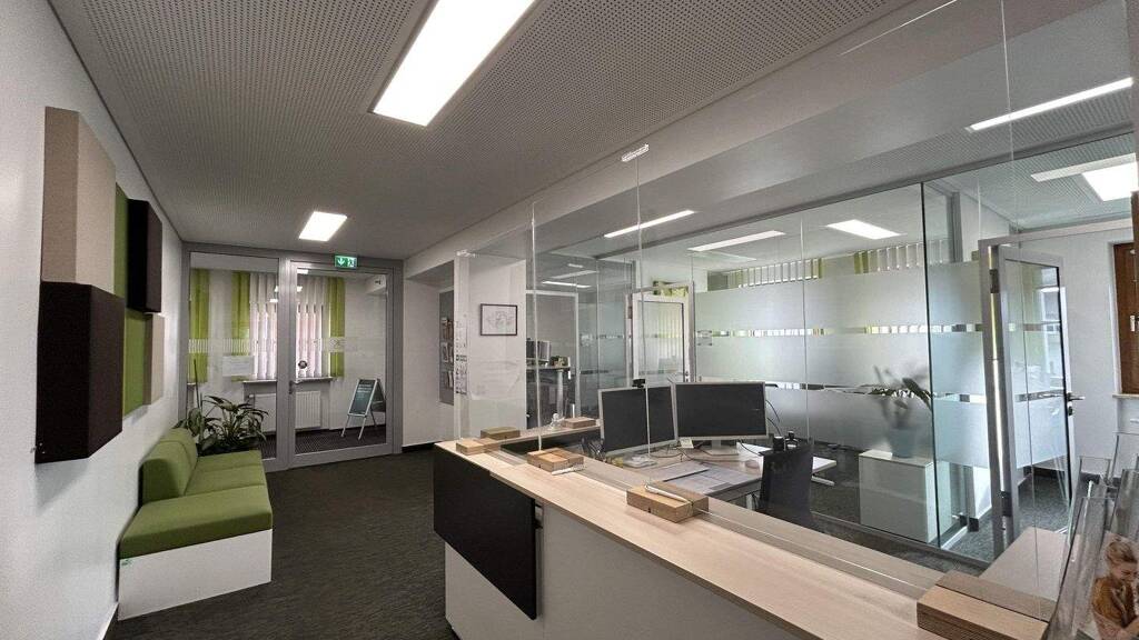 Im Erdgeschoss wurde eine helle, freundliche Empfangstheke mittig verbaut, die durch Glaswände von den weiteren 5 Büros und einem abgegrenzten Warteraum umgeben ist. Aufgrund der durchdachten Glasgestaltung erleben Sie hier ein helles und freundliches Raumgefühl.