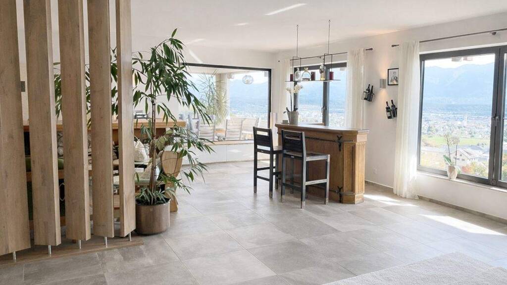 Die durchdachte Rauminszenierung schafft ein außergewöhnliches Wohngefühl, getragen von Licht und Weite. Der Blick schweift über Villach bis hin zu den Karawanken.