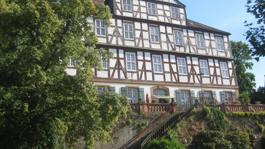 Das Haus ist Teil des "Oberhofs" in der kleinen Landstadt Schweinsberg im Landkreis Marburg. Von der geräumigen Wohnung im 2.Stock hat man eine fantastische Panoramaaussicht bis zu den Marburger Lahnbergen.
