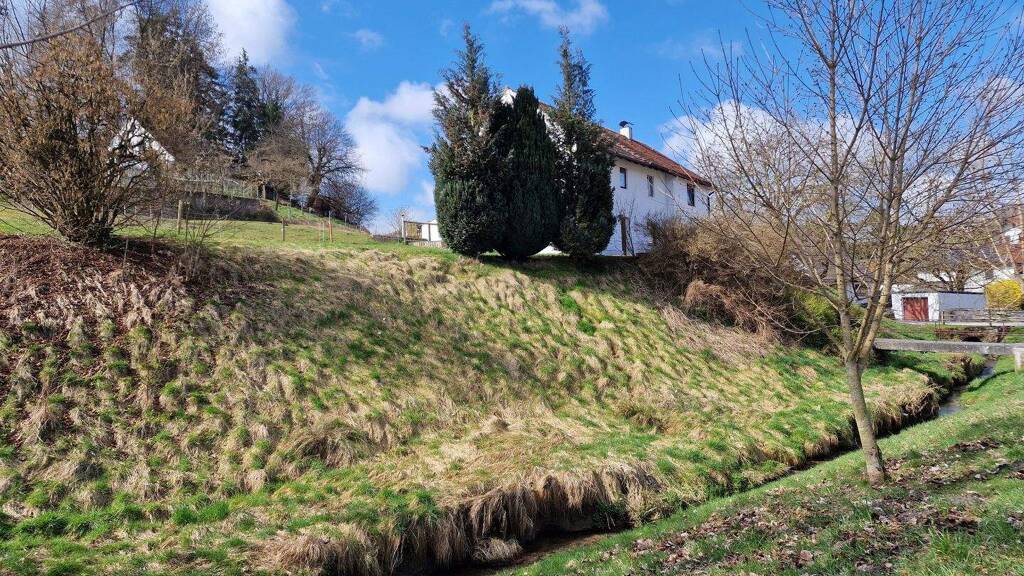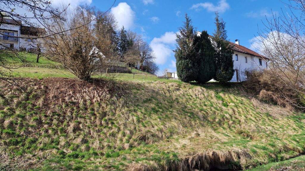 Baugrundstück, voll erschlossen mit Altbestand (mit zwei alten Häusern und einer großen Garage und einem Nebengebäude - der Abriß liegt im Bereich von ca. 50.000,- €). Die Immobilie liegt im Zentrum der Gemeinde auf einem Hang, erhöht zur Straße und direkt am Erlbach.