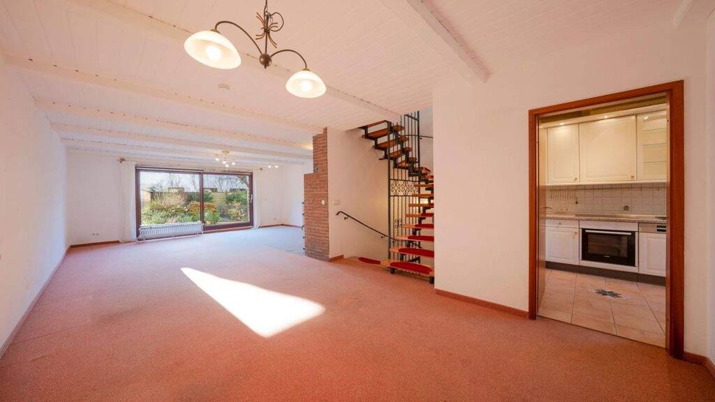 Herzstück des Hauses ist der offen gestaltete Wohn- und Essbereich mit einem charmantem Ofen, der wieder zum Leben erweckt werden kann. Eine separate Küche, ein praktischer Windfang im Eingangsbereich sowie das Gäste-WC ergänzen das Erdgeschoss. Über große Fenster gelangt man in den liebevoll angelegten Garten mit Terrasse: ein grünes Paradies für entspannte Stunden. Ein kleines Gartenhäuschen schafft zudem praktischen Stauraum für Freizeit- oder Gartengeräte.