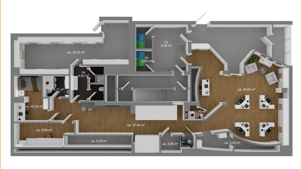 Die Räumlichkeiten eignen sich hervorragend als Büro, Ausstellungsfläche, Ladenlokal oder zur anderweitigen gewerblichen Nutzung. Hier sind Ihren Ideen keine Grenzen gesetzt!