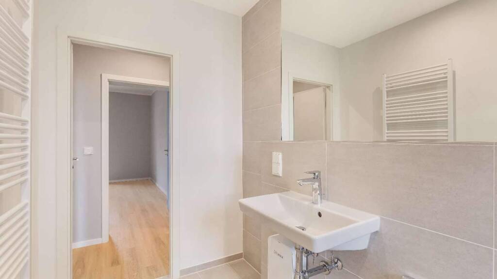 Das moderne Badezimmer lässt keine Wünsche offen. Großformatige Fliesen in hellgrau geben dem Badezimmer einen stilvollen Look. Es wurden hochwertige Armaturen von GROHE und Keramik von Villeroy & Boch verbaut.