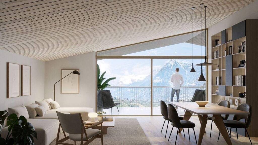 Dieses Penthouse in Meran/Obermais verbindet moderne Wohnarchitektur mit einer großzügigen, offenen Raumgestaltung. Der weitläufige Wohn- und Essbereich mit integrierter Küche wird von großen Glasfronten geprägt, die einen exklusiven Ausblick eröffnen und den Innenraum mit viel Tageslicht durchströmen. Die breite Terrasse erweitert den Wohnbereich nach außen und bietet eine hochwertige Außenfläche mit Panoramaeffekt. Zwei Schlafzimmer und zwei elegant ausgestattete Badezimmer schaffen eine klare, komfortable Raumaufteilung. Die Ausführung im Klimahaus A-nature-Standard - inklusive dreifach verglaster Holz-Alu-Fenster, Fußbodenheizung mit Kühlfunktion, dezentraler Wohnraumlüftung und Photovoltaikanlage - gewährleistet energieeffizienten Wohnkomfort. Die Kombination aus lichtdurchfluteten Räumen, exklusiven Ausblicken und moderner Neubauqualität verleiht diesem Penthouse einen repräsentativen Charakter. Eine Einzelgarage ist für 44.000€ und eine Doppelgarage für 88.000€ zusätzlich erhältlich.