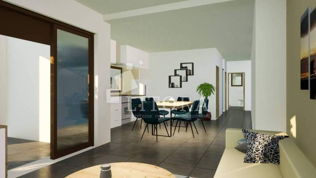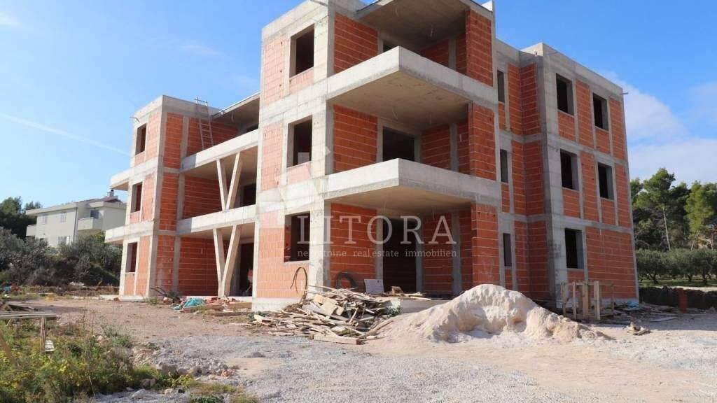 Vodice - Neubau: 3-Zimmer-Wohnung mit einer Gesamtnutzfläche von 87,71 m² im 2. Stock eines Wohngebäudes. Die Wohnung ist nach Osten ausgerichtet und besteht aus einem Flur, drei Schlafzimmern, einem Badezimmer, einem separaten WC sowie einem Wohn- und Essbereich mit offener Küche. Von hier aus gelangt man auf eine 10,49 m² große Terrasse mit Meerblick. Die Wohnung ist ausgestattet mit Sicherheitstüren, Klimaanlagen in allen Räumen, elektrischen Rollläden sowie Fußbodenheizung in den Bädern und im Wohnzimmer. Zur Wohnung gehören ein Außenstellplatz und ein 4,92 m² großer Kellerabstellraum mit Ladestation für Elektroautos. Der Strand ist 1.300 m und das Stadtzentrum 1.000 m entfernt.
