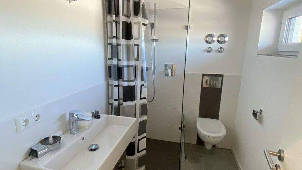 Die separat zugängliche OG-Ebene ermöglicht eine klare räumliche Trennung von Arbeiten, Wohnen und Privatzonen. Die zwei großzügigen Räume bieten ausreichend Platz für eine moderne Möblierung. Das Badezimmer mit bodengleicher Dusche ist mit hochwertigen Sanitärgegenständen ausgestattet.