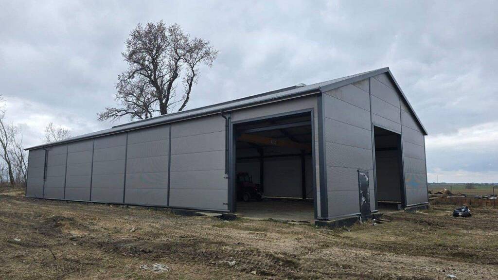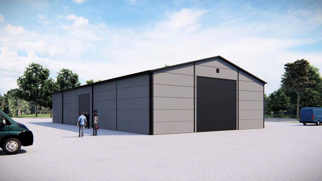 .2 Segmenttore mit einer Breite von 4,00 m x 4,00 m. Hergestellt aus Sandwichplatten mit einer Stärke von 45 mm mit einem Kern aus schwer entflammbarer Polyurethanschaum. Die äußeren Verkleidungen des Segments bestehen aus feuerverzinktem und lackiertem Blech.