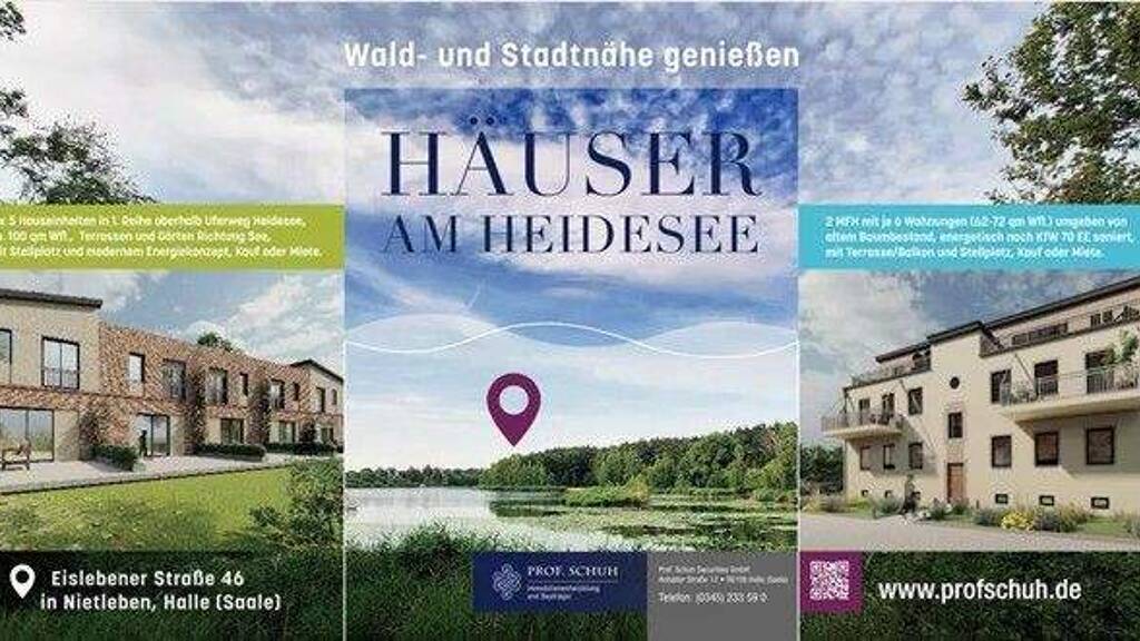 Das Bauvorhaben befindet sich im Stadtteil Halle-Nietleben in unverbaubarer Uferlage, nur wenige Meter vom Heidesee entfernt. Dieser bietet zahlreiche Freizeitmöglichkeiten wie das Heidebad mit Sandstrand. In unmittelbarer Nähe liegt die Dölauer Heide, ein Waldgebiet, das ideale Bedingungen für Spaziergänge und Erholung ermöglicht. Neben der naturnahen Lage ist das Wohnareal gut an das öffentliche Verkehrsnetz angebunden. In wenigen Gehminuten ist die nächste Straßenbahnhaltestelle zu erreichen, mit einer Fahrtzeit von circa 19 Minuten bis zum Marktplatz. Die optimale Autoanbindung an die B80 bietet eine schnelle Erreichbarkeit in die City von nur 10 Minuten. Einkaufsmöglichkeiten für den täglichen Bedarf befinden sich in nächster Nähe. Die Kombination aus einer sehr guten Anbindung an das öffentliche Verkehrsnetz und der unmittelbaren Nähe zum See und der Dölauer Heide schafft einen idealen Wohn- und Schlafort, der zugleich vielfältige Freizeit- und Erholungsmöglichkeiten bietet.