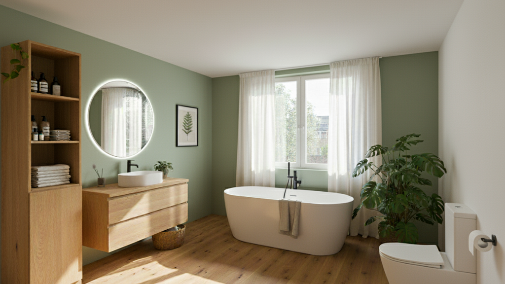 Das Badezimmer mit groĂźer Dusche ĂĽberzeugt mit hochwertigen Materialien von Vigour sowie einem zeitlosem Designkonzept.