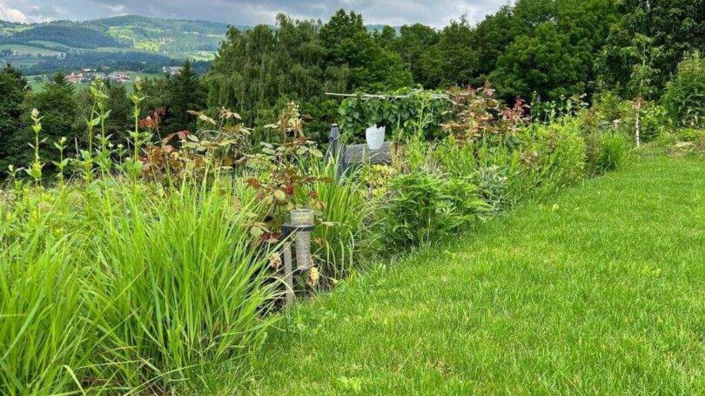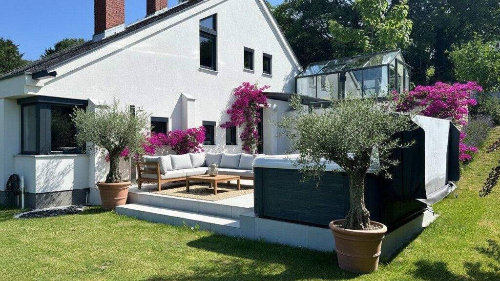 Das 890 m² große Grundstück ist liebevoll gestaltet und bietet viel Grün, geschützte Rückzugsbereiche und genügend Platz für Gartenfreunde. Der beeindruckende Ausblick eröffnet weite Blicke über die Landschaft - ein tägliches Highlight. Die große Terrasse lädt zu sonnigen Stunden, entspannten Grillabenden und gemütlichen Treffen ein. Eine Warmwasser-Außendusche sorgt an vielen Tagen oder nach Aktivitäten am See für angenehme Erfrischung. Der Jacuzzi bietet Ihnen zusätzlich Wellness in privater Atmosphäre. Ein Glashaus/Wintergarten rundet das Außenangebot ab - ein lichtdurchfluteter Raum, der sich perfekt für Pflanzen, kreative Hobbys oder ruhige Auszeiten eignet.