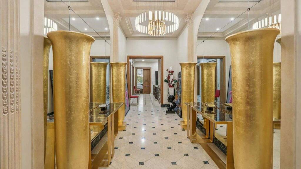 On the ground floor, an elegant entrance gallery leads to a majestic staircase and a mezzanine overlooking the main living room.